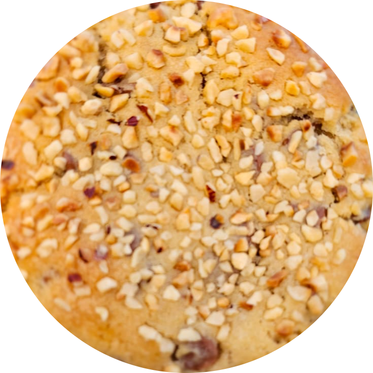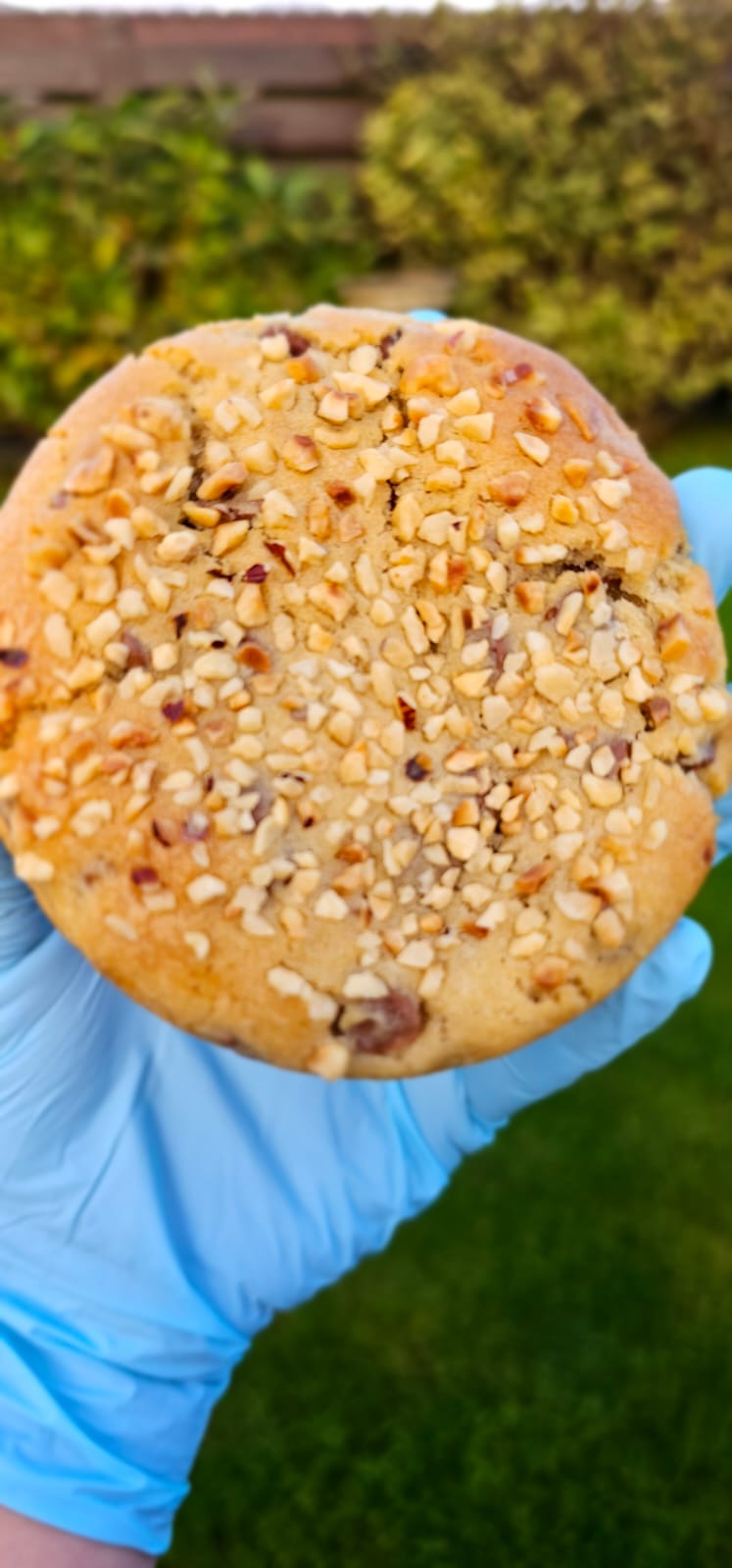 A soft vanilla cookie dough packed with milk chocolate chips, stuffed with a smooth hazelnut praline spread centre. Finished with a sprinkle of toasted hazelnuts on top.