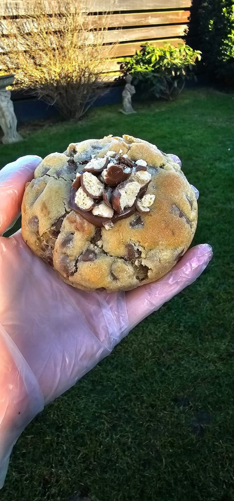 A soft vanilla cookie dough packed with milk chocolate chips and crushed malted milk biscuits, stuffed with a smooth Malteser spread centre. Finished with a sprinkle of crushed Maltesers on top.