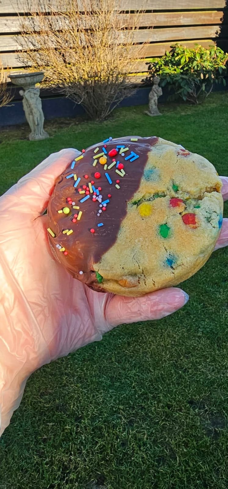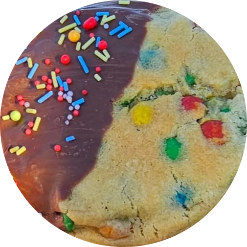 A soft vanilla cookie dough packed with milk chocolate M&M’s, stuffed with a rich Nutella centre. Finished with a drizzle of chocolate and a sprinkle of bright, colourful toppings.